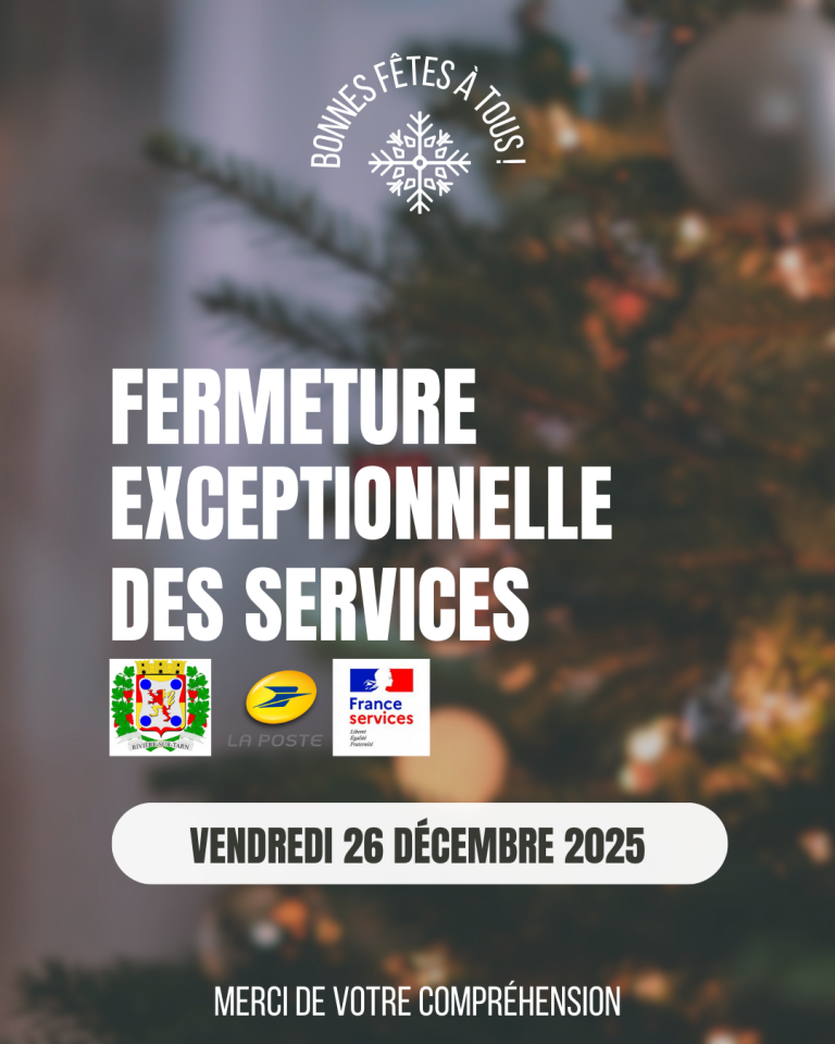 La mairie, la Poste et la Maison France Services de Rivière-sur-Tarn seront fermées exceptionnellement le vendredi 26 décembre 2025. Les services ré ouvriront le lundi 29 décembre 2025. Merci de votre compréhension.