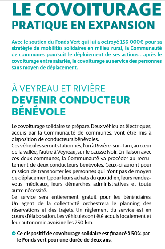 La Communauté de Communes Millau Grands Causses a fait l’acquisition de 2 véhicules électriques qui vont être mis à disposition et stationnés sur la commune de Rivière sur Tarn et de Veyreau. Deux conducteurs bénévoles auront pour missions de transporter les personnes sans moyen de transport pour leurs courses, leurs démarches administratives, leurs rendez vous médicaux… Le service sera entièrement gratuit. Le planning des trajets et des réservations sera organisé par un agent de la mairie.