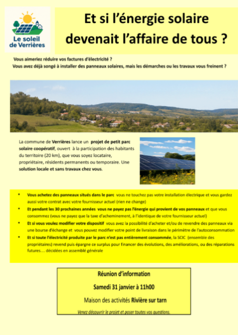 La commune de Verrière lance un projet de petit parc solaire coopératif ouvert à la participation de habitants (20km). Réunion d’information le Samedi 31 Janvier à 11h à la Maison des Activités de Rivière sur Tarn.